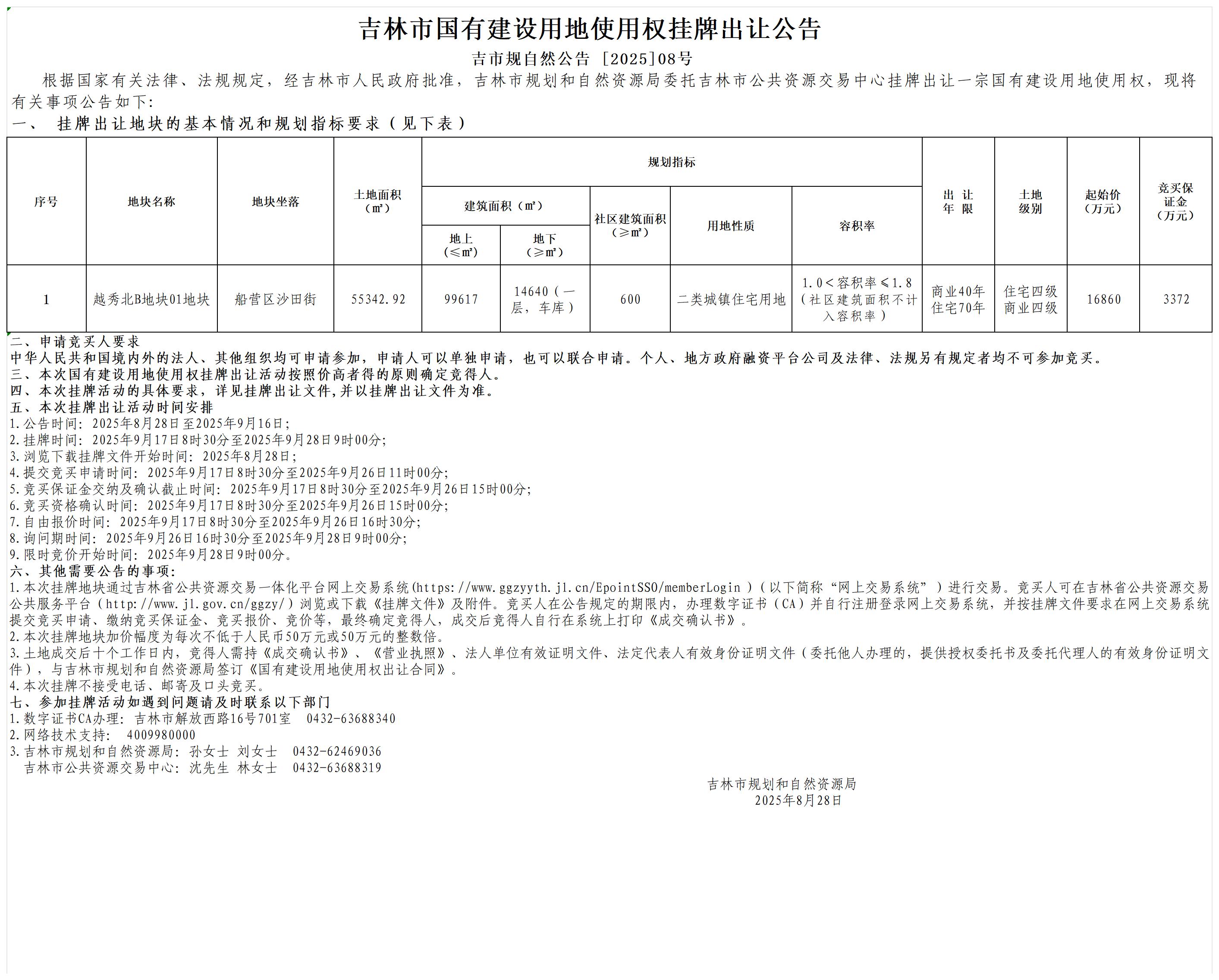 | 标 题: | 吉林市国有建设用地使用权挂牌出让公告(吉市规自然公告 [2025]08号) |