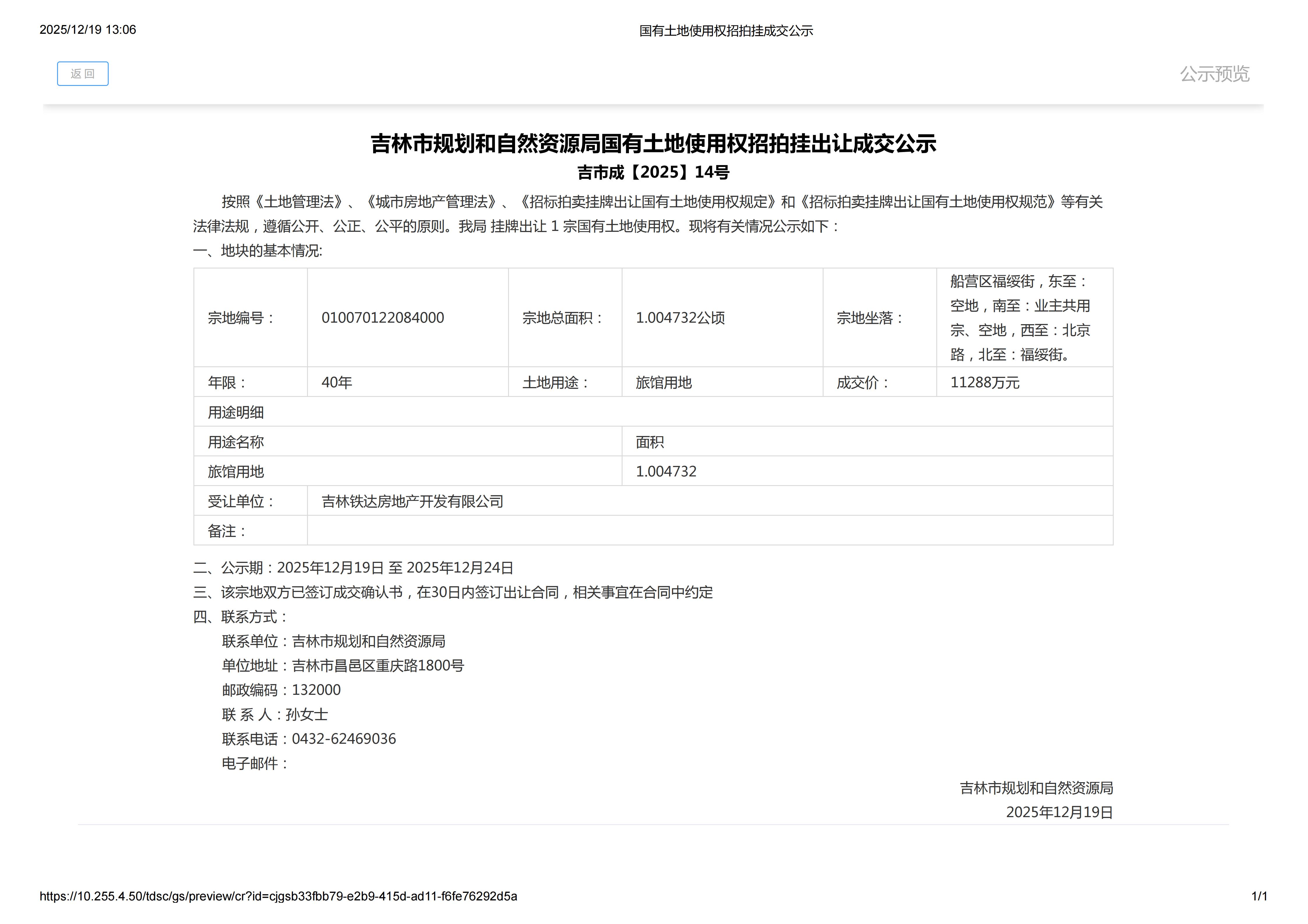 | 标 题: | 吉林市规划和自然资源局国有土地使用权招拍挂出让成交公示(吉市成【2025】14号) | ||