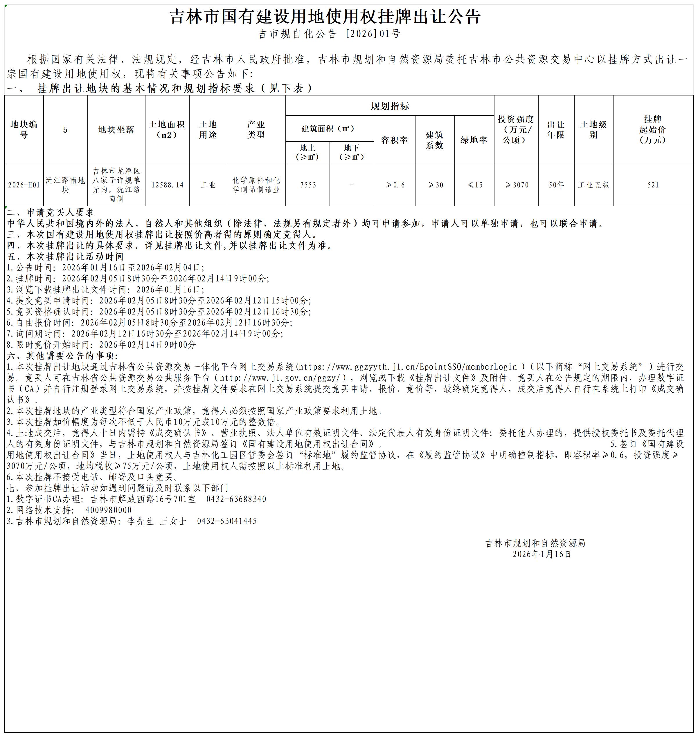 | 标 题: | 吉林市国有建设用地使用权挂牌出让公告(吉市规自化公告 [2026]01号) |
